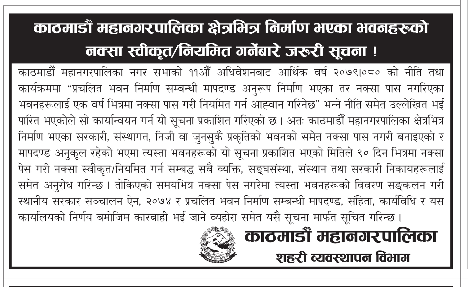 काठमाडौं महानगरभित्र नक्सा पास नगरी बनाइएका भवनकाे नक्सा ९० दिनभित्र पेश अल्टिमेटम